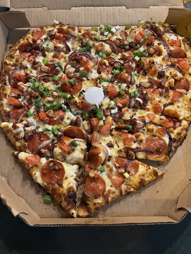 Chicken, Italian sausage, linguica (pork sausage), BBQ drizzle, tomatoes, red onions, green onions, and zesty red sauce on original crust.